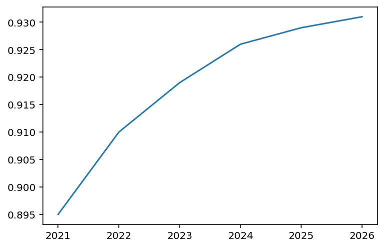 year = [0.895, 0.91, 0.919, 0.926, 0.929, 0.931]